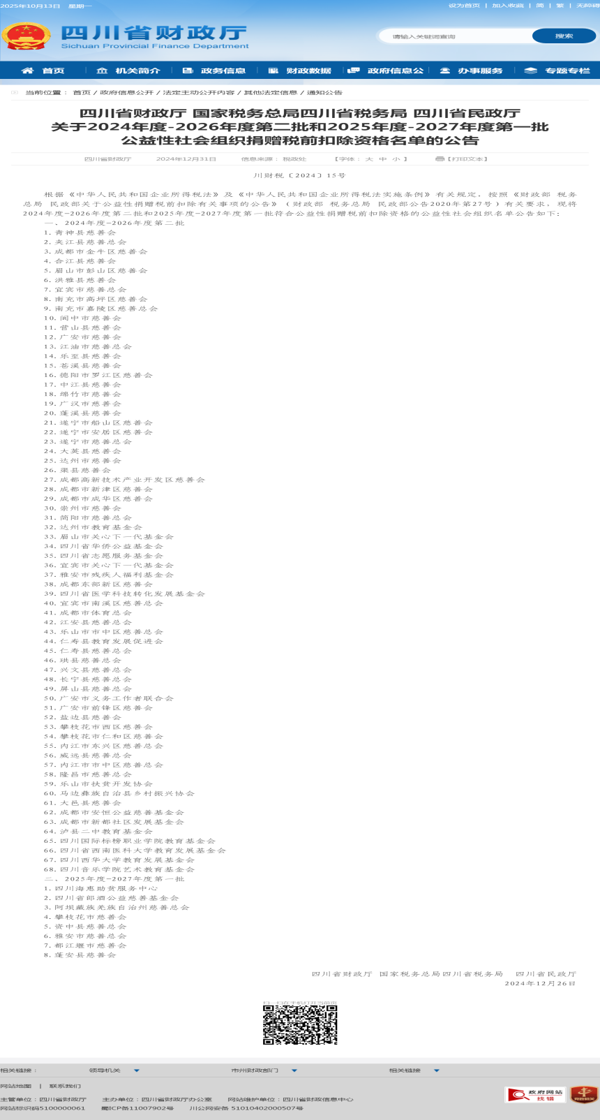 四川省财政厅 国家税务总局四川省税务局 四川省民政厅《关于2024年度-2026年度第二批和2025年度-2027年度第一批公益性社会组织捐赠税前扣除资格名单的公告》(川财税〔2024〕15号)