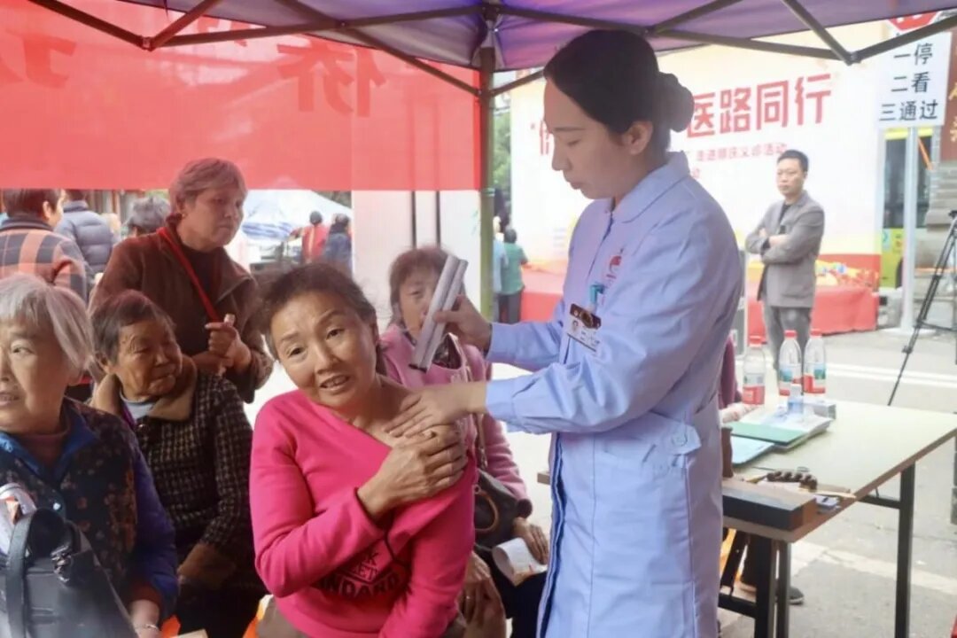 仪式结束后,各项服务迅速开展。工作人员向现场民众发放活动手册,清晰指引服务流程,引导大家有序参与,确保每一位有需求的民众都能高效享受服务。在义诊区,来自口腔科、康复科的医疗团队各司其职,耐心接待每一位就诊民众。他们细致询问病情、认真检查身体、开具诊疗方案,针对颈肩腰腿痛等问题现场开展康复理疗。同时,工作团队还为民众发放爱心健康包,将健康关怀实实在在送到手中。